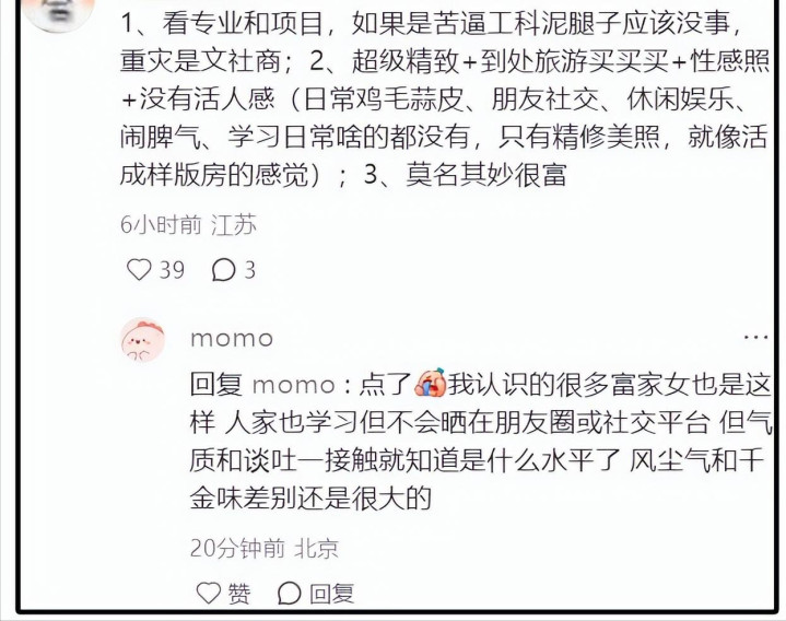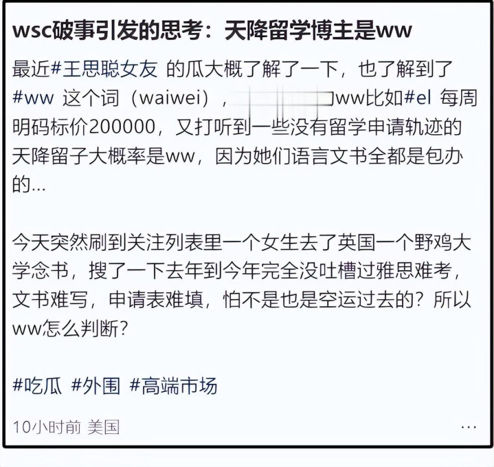 也有人扒出她的留学背景,质疑她去的是“野鸡大学”,没发过一条关于雅思、文书、申请的吐槽,像极了“空运过去的”。